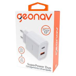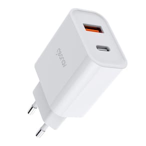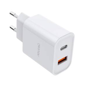 Carregador de parede com 2 saídas de carregamento rápido. Leve e compacto, ideal para usar em escritórios e ótimos para viagens. Perfeito para carregar smartphones e outros dispositivos que também possuem a tecnologia Power Delivery de até 20W pela porta USB-C ou dispositivos compatíveis com a tecnologia Quick Charge de até 18W pela porta USB-A.