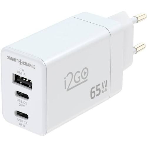 1 carregador de parede ultra rápido i2go power delivery com 1 saída usb-c 65w + 1 saída usb-c 20w + 1 saída usb-a 18w - i2go pro