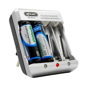 Modelo: KP-511A Compatível com pilhas AA, AAA e 9V 4 Posições para pilhas AA 4 Posições para pilhas AAA 1 Posição para bateria 9V Alimentação: 110 ~ 220Vac Alta eficiência LED indicador Acompanha 2 Pilhas AA