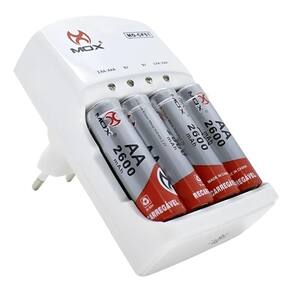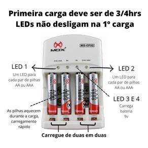 Dúvida sobre o funcionamento do carregador mox 50/51/52/53 No primeiro uso as luzes de led do carregador não desligam, pois ficam muito tempo paradas na fábrica e acabam zerando completamente, portanto pedimos que carregue as pilhas de 3/4 horas e não ultrapasse esse período, usando preferencialmente as pilhas mox para o primeiro uso e já pode usa-lás normalmente até a carga acabar, e depois só carregar novamente. Em alguns casos você precisará repetir o processo novamente caso haja algum problema desse tipo, pedimos que antes de abrir uma reclamação, faça o que estamos comunicando e também assista o video postado no anúncio caso tenha alguma dúvida em como utilizar o produto.