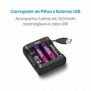 O Carregador de Pilhas USB da Elgin é a solução moderna e portátil para nunca ficar sem energia. Leve e compacto, ele pode ser alimentado por qualquer porta USB e já vem com 2 pilhas recarregáveis AA de 1500mAh, pronto para uso em qualquer lugar.