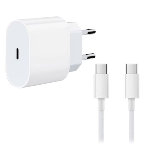 Carregador USB-C de 35W com carregamento rápido. Inclui cabo USB-C/USB-C com aproximadamente 1m de comprimento.Tipo