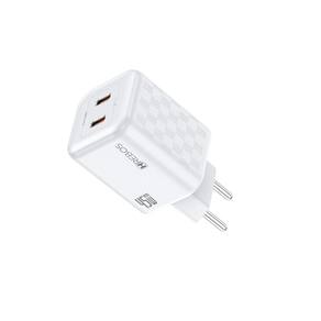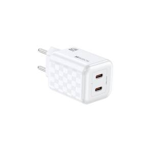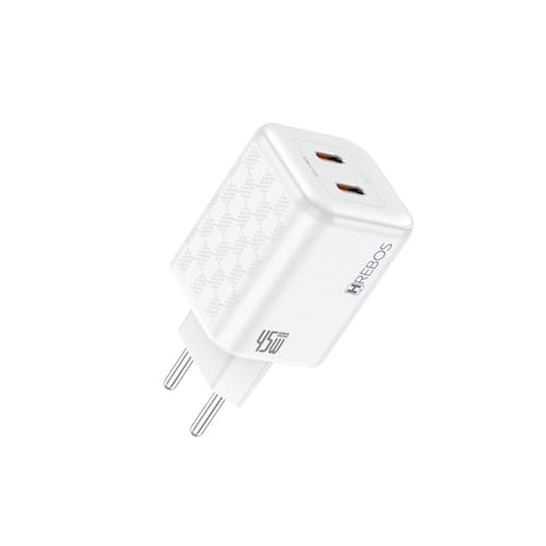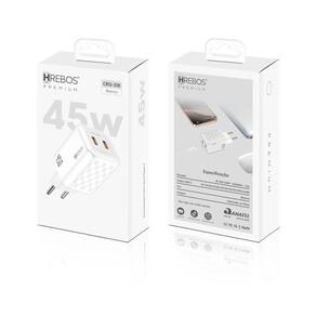 Carregador Hrebos Premium White Chess CRG-218 de 45W com duas portas USB-C. Suporta Power Delivery (PD) em ambas as portas. Design com acabamento texturizado em padrão xadrez. Carcaça em polímeros de alta densidade com propriedades retardantes de chama. Múltiplos sistemas de proteção eletrônica contra sobrecarga, picos de tensão, superaquecimento e curto-circuito.Tipo