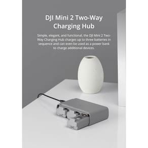 Carregar baterias: Carrega até três baterias em sequência Suporte a outros dispositivos: pode ser utilizado como um banco de energia para carregar dispositivos adicionais Quando você obter: dji Mini 2 Two-Way Charging Hub x1 Dimensões da embalagem: 100,0 L x 36,0 A x 125,0 W (milímetros) Trabalhe apenas com dji Mini 2. Não trabalhe com a série dji Mavic Mini.