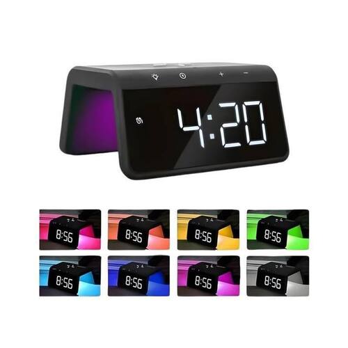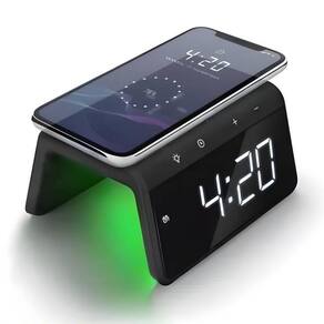 Carregador indução preto led 08 cores relógio e despertador Carregador de mesa por indução com relógio e despertador ===================================== Contém: 01 unidade