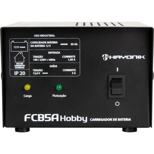 A linha de carregadores FCB HAYONIK possuem um sistema inteligente e contam com gerenciamento de tensão e corrente que controla todos os estágios da carga. O carregador de baterias FCBP50E é excelente para efetuar cargas em baterias em situações de emergência, além de portátil, fácil de usar e de fácil transporte. São fabricados e desenvolvidos com matérias primas de excelente qualidade, possuindo uma carcaça de aço, revestida com pintura eletrostática. São indicados para baterias de até no máximo 65A, ou seja, para veiculos automotores como carros de porte menor e populares. Podem ser alimentados nas tensões 127Vac ou 220Vac, lembrando que deve ser ajustado por chave seletora com corrente máxima de carga 5A. Ao final do processo de carga, ou seja, após atingir a carga máxima da bateria, o gerenciador de tensão e corrente entra no estágio de flutuação, onde ele vai fornecendo apenas cargas mínimas para a manutenção, o que mantém a bateria carregada sem ocasionar o desgaste, garantindo a máxima eficiência do produto. Além disso possui LEDs indicadores de carga, transistores MOSFETs para controle de carga e um Relé de proteção quando as garras polarizadas invertidas ou curto-circuito entre elas.Conector:Garra jacaré isolada Peso:2,95 Kg Fusível de Saída:3A Pesquisa:carreg|flutuação|flutuador|carga|jacare|