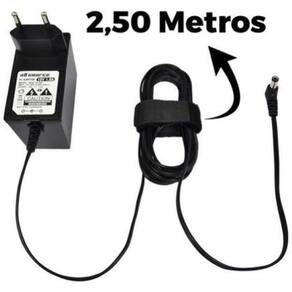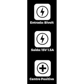 Quais as especificações do produto - input: bivolt 110 - 240v 50-60hz 0.33a - output: 15v - 1.5a positiva - plug: 5,5mm x 2,5mm - comprimento do rabicho: 2,50 metros - cabo de força: acompanha - medidas da fonte: comprimento = 8,7 cm / largura = 4,8 cm / altura = 2,7 cm - cor: preto - atente-se também ao pino conector, ele deve ser igual ao utilizado no seu aparelho comprimento e largura .