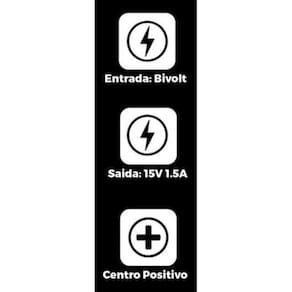 Quais as especificações do produto - input: bivolt 110 - 240v 50-60hz 0.33a - output: 15v - 1.5a positiva - plug: 5,5mm x 2,5mm - comprimento do rabicho: 2,50 metros - cabo de força: acompanha - medidas da fonte: comprimento = 8,7 cm / largura = 4,8 cm / altura = 2,7 cm - cor: preto - atente-se também ao pino conector, ele deve ser igual ao utilizado no seu aparelho comprimento e largura .