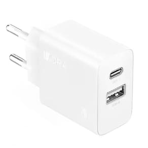 Carregador com duas portas (USB-A e USB-C), tecnologia de carregamento rápido PD 20W, inclui cabo de 1 metro. Design compacto e portátil, ideal para uso diário e viagens. Possui mecanismos de segurança contra sobrecarga, superaquecimento e curtos-circuitos.Tipo
