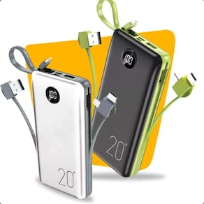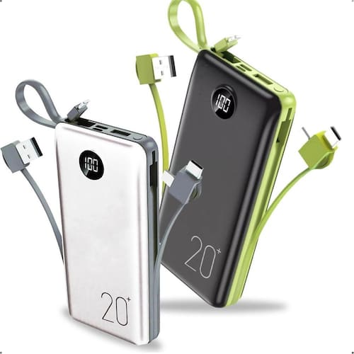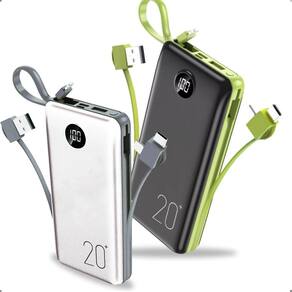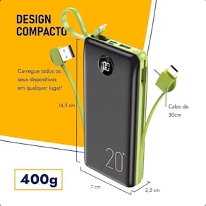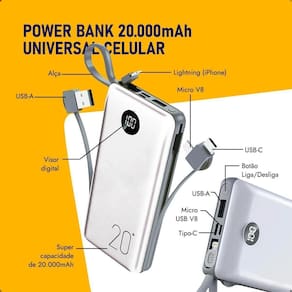 Capacidade de 20.000mAh, ideal para múltiplas recargas. Possui saídas duplas para carregar dois dispositivos simultaneamente. Suporta aproximadamente de 4 a 6 cargas completas. Design compacto e portátil.Tipo