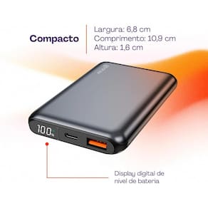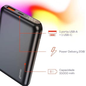 Carregamento rápido com Power Delivery 20W e Quick Charge 18W. Até 50% de carga em 30 minutos. Display LED indica porcentagem de carga e carregamento rápido. Função Pass Through permite carregar o power bank enquanto carrega um dispositivo. Bateria de polímero de lítio Grau A+ com proteções contra sobrecarga, curto-circuito, sobretensão e superaquecimento.Tipo