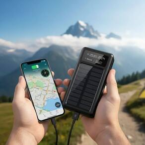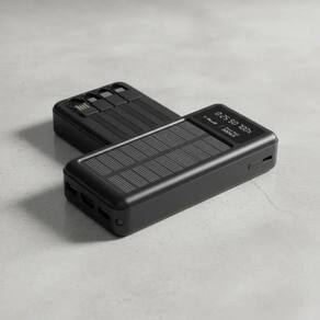 Carregador portátil com alta capacidade de 30000mAh, tecnologia de carregamento rápido e painel solar integrado para recarga em emergências. Possui 3 portas de saída USB, tela LED digital para visualização de carga e cabos integrados (iPhone/Tipo C/Micro USB) para maior conveniência. Entrada Tipo C e USB para recarga do próprio power bank.Tipo