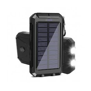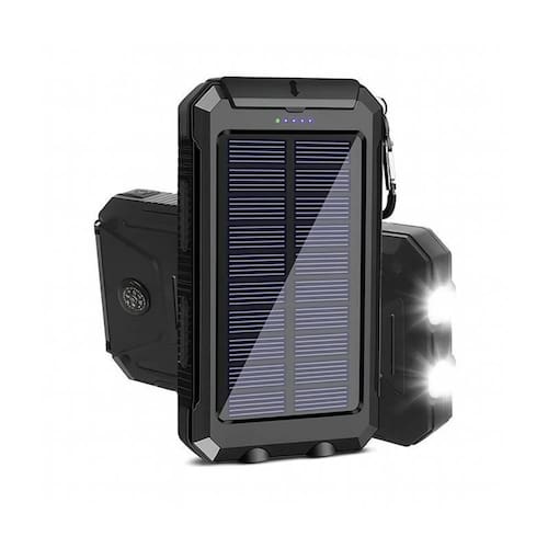 Power Bank Solar Portátil com chip integrado de reconhecimento inteligente de voltagem, bateria de alta capacidade e qualidade, suporta carregamento rápido, painel solar integrado, lanterna LED dupla integrada com 3 modos de iluminação (contínuo, SOS e estroboscópico), carregamento rápido via USB, entrada tipo C USB, mosquetão para prender em bolsas ou equipamentos.Tipo