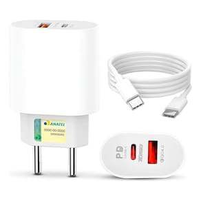 Carregador rápido de 20W com conexão dupla (USBA e USBC). Projeto elétrico com proteções contra sobrecorrente, sobrecarga e aquecimento. Formato compacto e acabamento branco.Tipo