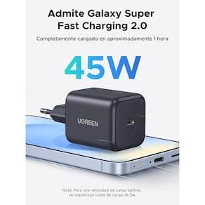 Carregador rápido USB-C portátil UGREEN de 45W com tecnologia GaNInfinity e PPS. Suporta PD 3.0, PPS 45W/25W e QC 4+/3.0. Carregamento Super Fast Charge 2.0 para Galaxy. Tecnologia GaNInfinity para tamanho compacto, alta eficiência e menor geração de calor. Proteção contra curtos-circuitos, sobretensão, superaquecimento e sobrecorrente com tecnologia ThermalGuard.Tipo