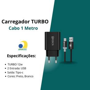 -2 portas USB -turbo 12w -1 Metro -homologado pela Anatel -cor Preto -produto de alta qualidade