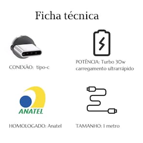 Características Gerais do produto Carregador turbo 30W de carga ultra rápida, acometrospanha cabo tipo C de 1 Metro reforçado, produto hometrosologado pela Anatel.