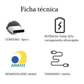 Carregador turbo 30W com cabo tipo C de 1 metro reforçado. Homologado pela Anatel.Tipo