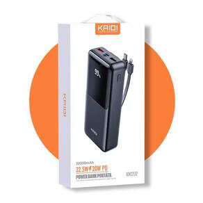 Carregador portátil com capacidade de 20.000mAh e potência de 22.5W. Possui carregamento turbo de alta velocidade, visor digital LED inteligente, cabos embutidos Tipo C e Lightning (iOS), e 2 entradas USB adicionais. Homologado pela Anatel.Tipo