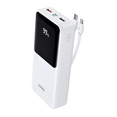 Carregador Turbo Portátil Kaidi KNC232 20000mAh com 22.5W de potência. Possui cabos embutidos Tipo C e Lightning (iOS), além de 2 entradas USB adicionais. Conta com visor digital LED inteligente para monitoramento do nível de carga.Tipo