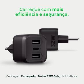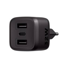 Carregador ultrarrápido com tecnologia GaN, 32W de potência, 3 portas USB (2x USB-A, 1x USB-C), suporte a USB-C Power Delivery (PD) de até 30W, proteção contra surtos de tensão, sobrecarga e curto-circuito, design compacto e fabricado com plástico antichamas.Tipo