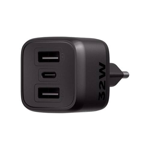 Carregador ultrarrápido com tecnologia GaN, 32W de potência, 3 portas USB (2 USB-A + 1 USB-C), suporte a USB-C Power Delivery (PD) de até 30W, proteção contra surtos de tensão, sobrecarga e curto-circuito. Design compacto e fabricado com plástico antichamas.Tipo