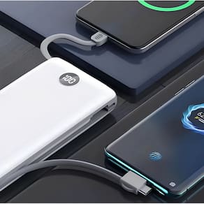 Carregador portátil e versátil para seu celular e acessórios, boa capacidade de carga com 20.000 mAh você pode carregar mais de um aparelho por vez graças aos seus cabos embutidos e sua saída USB. Ideal para levar na bolsa, mochila e mala.