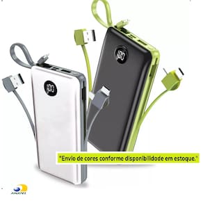 - Capacidade: 20.000mAh 3.7V 74Wh - Carregamento rápido - Com indicador de Carga; - 2 Cabos embutidos - Cabos: Lightning, Usb, Micro e Type-C; - Compatível: celulares, tablets, gps, fones ou outros pequenos dispositivos eletrônicos simultaneamente. - Versátil: permite a recarga simultânea de dois aparelhos ou mais. - Saídas: 5V/2.1A - Anatel 084352211767 - Cores: Preto Verde, Branco Cinza e Preto Vermelho (Envio de acordo com a disponibilidade de estoque)