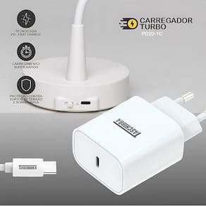 Carregador USB-C Carga Rápida 5V 2A, Bivolt, Formato Retangular, Produzido em Plásticos de Engenharia, Metal e Componentes Elétricos.Tipo