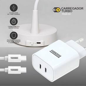Carregador USB-C Duplo Carga Rápida 5V 2A, Bivolt, Formato Retangular, Produzido em Plásticos de Engenharia, Metal e Componentes Elétricos.Tipo