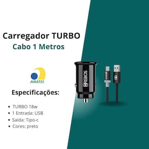 Carregador veicular turbo 18W com conexão USB Tipo-C. Possui tecnologia de carregamento rápido Fast Charge, entrega potência de até 18W e conta com proteções contra sobrecarga e superaquecimento.Tipo