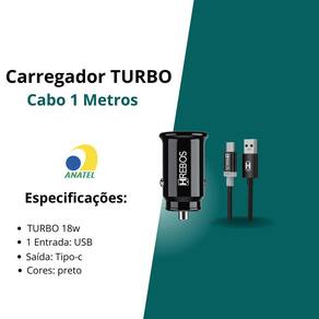 Carregador veicular 18W com tecnologia de carregamento rápido Fast Charge, conexão USB Tipo-C, design moderno e resistente, proteção contra sobrecarga e superaquecimento.Tipo