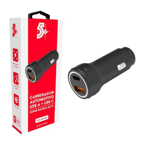 Carregador automotivo com 2 portas USB (USB-A e USB-C), potência total de 30W, tecnologia PD Power Delivery para carregamento super rápido.Tipo