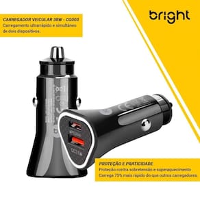 Carregador veicular com 2 portas (Tipo C-PD e USB QC), carregamento ultrarrápido e simultâneo de dois dispositivos.Tipo