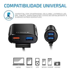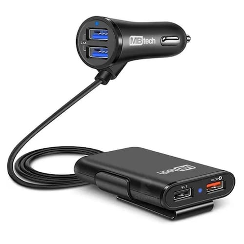 O multi Carregador Veicular TURBO da MBTech possui 4 portas USBEste carregador permite carregar quatro dispositivos ao mesmo tempo e não discriminar entre aqueles no banco da frente ou de trás, Projetado para usar 2 saídas USB na Frente e 2 saídas USB atrás.Projetado com um cabo de 1,80 metros e quatro portas USB, o Carregador veicular da acesso ao motorista e também ao passageiro do banco da frente, ou seja carrega 2 aparelhos ao mesmo tempo nos assentos dianteiros do veiculo.Ele também tem um HUB extensível com mais duas portas USB adicionais, o extensor possui cabo reforçado com 1,80 metros de comprimento para alcançar facilmente o banco traseiro, proporcionando aos passageiros na parte de trás, mais duas portas USB para carregar mais dois aparelhos.Perfeito para longas viagens em família, assistir filmes em Smartphones ou Tablets ou até mesmo para você oferecer o melhor conforto para seus clientes em UBER ou TÁXI.As duas portas USB frontais com velocidade de 2.4A por porta, enquanto o HUB extensível permite que os passageiros do banco traseiro tenham duas saídas TURBO com 3.0A e 3.1A, simultaneamente.Basta ligar o carregador em fonte de energia de 12V no veiculo e em seguida prenda o HUB extensível no banco traseiro do condutor ou passageiro para facilitar o acesso as portas de carregamento.As duas partes do carregador, possuem luz LED na cor azul indicando o funcionamento.O carregador traseiro HUB, possui uma garra/clipe de fixação para prender ao assento traseiro e ficar mais confortável.Compatível com:- Smartphones- Celulares- Lanternas LED- GPS- Tablets- Jogos Portáteis- Caixas de som Bluetoothe diversos outros dispositivos.Informações Técnicas:02 Portas USB no conector frontal02 Portas USB no extensor para o banco traseiroProteção contra sobrecarga, mais segurança para os seus dispositivos.CONEXÕES:- 04 Portas USB Universal 3.0- 01 Cabo extensor com 1,80 metros de comprimento.Entrada: DC 12V-24VSaída: DC 5V / 3.1A 9V / 1.8A 12V / 1.8apossui regulador automático de potência.