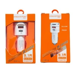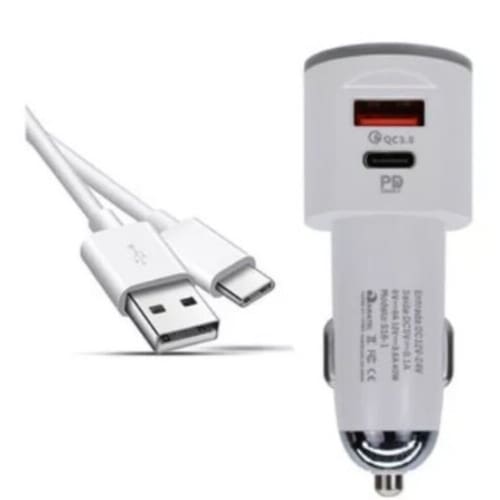 Carregador veicular com duas entradas (Tipo C e USB), suporta carregamento rápido PD+CQ 3.0. Potência de 18W + 18W. Inclui cabo USB-A para USB-C de 1 metro.Tipo