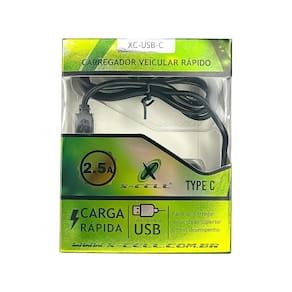 Carregador veicular com cabo USB Tipo C, 2.5A de corrente de saída, 1 metro de comprimento de cabo. Design elegante e compacto para uso em veículos.Tipo