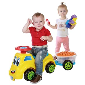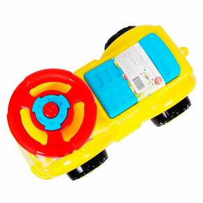 Além de um carrinho com buzina, acompanha um mini trailer para guardar e transportar os blocos de montar, que acompanham o baby ride