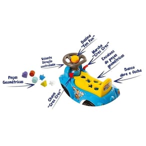 Banco Interativo: O banco do carrinho pode ser aberto e fechado de maneira prática, criando formas de brincar e estimulando a interação com o brinquedo. Essa funcionalidade também ajuda a desenvolver a habilidade de manuseio e coordenação.Peças Geométricas Coloridas: O carrinho vem com 6 peças geométricas coloridas que podem ser encaixadas de diversas formas no compartimento do brinquedo. Essa atividade desenvolve a percepção de formas e cores, além de estimular a resolução de problemas e a motricidade fina.Buzina Divertida: Para completar a diversão, o carrinho possui uma buzina que emite sons divertidos, tornando a brincadeira ainda mais realista e interativa.