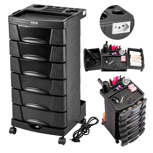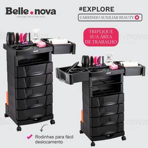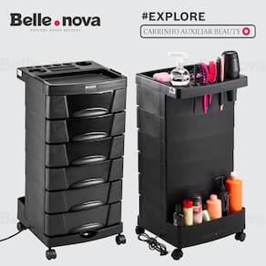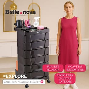 Além disso, o Carrinho Auxiliar Beauty Care é composto por 6 gavetas plásticas, possui tomada embutida e extensão elétrica certificada pelo INMETRO. Com porta secador, porta escovas e encaixe para acoplar duas gavetas ao tampo, oferece praticidade e organização para o profissional da beleza.