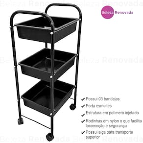 O Carrinho Auxiliar Estética com 1 Tampo MDF e 2 Bandejas é o item perfeito para organizar seus esmaltes e acessórios de manicure. Com suas bandejas em plástico polipropileno (PP) super resistente e estrutura em ferro com pintura eletrostática, este carrinho é altamente durável e resistente a riscos. Suas dimensões são: Altura 46 cm x Profundidade 30 cm x Largura 40 cm. Além disso, possui 4 rodinhas para facilitar o transporte.