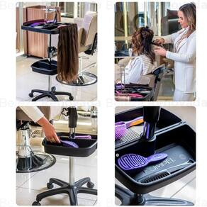 Tampo FuncionalO carrinho possui um tampo com suporte exclusivo para prancha alisadora, tigelas metálicas removíveis para cola/queratina, suporte de pinças e ampla área de trabalho com divisórias para organização de acessórios. Além disso, conta com pentes laterais resistentes a variações de temperatura, facilitando o manuseio das mechas.