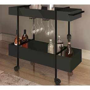 Carrinho Bar, Linha Complementos Artesano, também chamado de carrinho de bebidas, possui estilo industrial e design minimalista, é versátil com combinação entre vários módulos. Possui estrutura em tubos de Aço e acabamento com pintura anticorrosiva na cor Preto Fosco. Madeira ecologicamente correta em MDP, com acabamento em pintura BP Fosco. Composto por 02 compartimentos resistentes que suportam 11 kg cada, puxador, suporte metálico para taças, você poderá acomodar seus itens decorativos, suas bebidas favoritas, copos, taças e outros acessórios para preparar os drinks de maior sucesso entre seus amigos e família, além de deixá-los sempre organizados para os momentos de descontração, acompanha rodízios que facilitam o da peça, permitindo que você o leve até para áreas externas ou onde mais quiser, garante um visual sofisticado e moderno para seu ambiente. Mais produtos da Linha Artesano, você encontra em nosso site, podendo fazer a composição completa para sua casa, são diversos itens com design prático e funcional para tornar a vida mais fácil e a casa mais alegre. Este móvel chegará em sua casa separado em 01 volume.