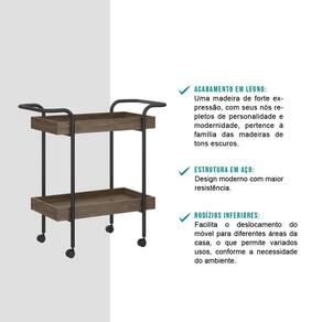 O Carrinho Bar Carraro é uma peça curinga para a decoração, extremamente versátil e funcional, pode ser utilizado em diversos ambientes da casa. É o complemento perfeito para compor o espaço e facilitar o dia a dia. Além disso, conta com rodízios que facilitam o deslocamento, possibilitando o compartilhamento da peça entre áreas diferentes.Especificações do Produto:Medidas: Largura: 84,5 cm | Altura: 83 cm | Profundidade: 40,5 cmPeso: 10,60 KgMatéria Prima: MDPAcessórios: RodíziosMontagem: Minifix e ParafusoGarantia:Os produtos possuem garantia de 03 meses (se usado em condições normais), contra defeito de fabricação, ou componentes utilizados.Esta garantia não cobre defeitos por uso inadequado ou abusivo, falta de cuidados e desbotamento natural dos revestimentos.Condições de perda da garantia:- Mau uso ou manuseio incorreto.- Desbotamento causado pela exposição direta da luz solar.- Danos causados por agentes da natureza, como inundações ou acidentes de qualquer espécie.- Uso indevido de produtos abrasivos para realizar a limpeza.- Decurso do prazo estabelecido.Recomendações para uma boa conservação:- Não utilizar na limpeza produtos abrasivos tais como: palha de aço, álcool, vinagre, limão, saponáceo, ou produtos corrosivos que possam riscar ou descolar a película protetora dos móveis.- Na limpeza de móveis em geral, napas e fórmicas, deve ser utilizado um pano levemente umedecido e sabão neutro.- Para a movimentação do móvel é importante que este seja levantado do chão, pois ao arrastá-lo pode causar avarias estruturais.- Não deixe o móvel em exposição a intempéries.Informações importantes:- Trabalhamos para apresentar imagens fiéis ao produto real. Porém, as cores podem sofrer variações de acordo com o monitor, iluminação do ambiente em que se encontram e até por sua percepção visual comparado ao ambiente residencial.- Desta forma, as imagens são meramente ilustrativas.- Todos os objetos decorativos não acompanham o produto.- O produto é enviado desmontado.- O produto acompanha manual com instruções para a montagem.