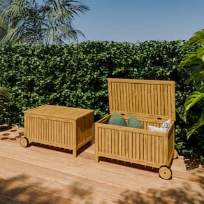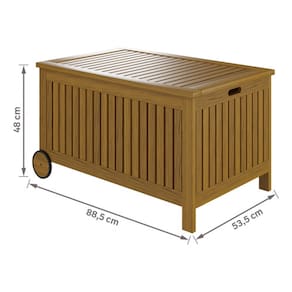 Características do Produto: Material: Fabricado em madeira de eucalipto tratada para áreas externas, combinando durabilidade e resistência às intempéries com a beleza do acabamento rústico. Dimensões: 88 cm de comprimento x 53 cm de largura x 48 cm de altura, oferecendo espaço amplo para armazenamento e uma altura confortável para uso como assento. Acabamento: Tinta na tonalidade caramelo, que realça a madeira e confere um visual natural e harmonioso com a natureza. Benefícios e Funcionalidades: Versatilidade e Organização: Ideal para jardins, piscinas, sacadas e varandas. Oferece um amplo espaço para guardar almofadas, mantas, utensílios e outros itens, mantendo tudo protegido e organizado. Design Prático e Confortável: Equipado com rodas, facilita o transporte e a movimentação pelo espaço. Sua superfície robusta suporta peso, podendo ser usada como assento adicional em encontros e eventos ao ar livre. Harmonia Decorativa: Com um visual elegante e harmônico, combina facilmente com móveis de jardim, como sofás, poltronas e espreguiçadeiras, permitindo que você crie um ambiente que reflete seu estilo e personalidade. Estilo e Funcionalidade para o Seu Espaço Externo O Carrinho Baú Organizador não apenas otimiza o espaço de armazenamento, mas também agrega charme e funcionalidade ao seu ambiente. Integra-se facilmente à linha Solarium, composta por móveis de jardim que transformam sua área externa em seu lugar favorito. Com durabilidade e estilo, este baú é uma escolha ideal para quem deseja um espaço sempre organizado, elegante e acolhedor!"