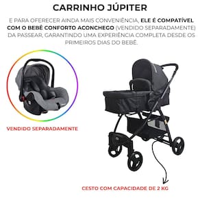 Carrinho de bebê 3 em 1 passear júpiter vira moisés travel system preto até 15 kg Este versátil carrinho 3 em 1 é a escolha ideal para pais modernos, oferecendo conforto e praticidade desde o nascimento até os 15kg da criança. Com um cinto de segurança de 5 pontos e estrutura em aço, o carrinho júpiter garante segurança e durabilidade incomparáveis. Seu assento reversível e ajustável em várias posições permite adaptar-se às necessidades dos pequenos em diferentes fases. O assento do carrinho júpiter pode ser transformado em um moisés para os momentos de descanso do bebê com facilidade. Possui 2 rodas dianteiras giratórias e fixas e 2 rodas traseiras com sistema único de freios, garantindo a estabilidade e mobilidade necessárias para os passeios. Além disso, com sistema de fechamento tipo envelope, tornamos o transporte e armazenamento do carrinho uma tarefa simples e rápida para os pais ocupados. E para oferecer ainda mais conveniência, ele é compatível com o bebê conforto aconchego vendido separadamente da passear, garantindo uma experiência completa desde os primeiros dias do bebê. Inmetro: 001548/2024 Características: Cor: preto Assento com ajuste em várias posições Cinto de segurança de 5 pontos Cesto com capacidade de 2 kg Capota retrátil Capa com extensor Porta copo Assento vira moisés Fechamento tipo envelope Freio com sistema único de acionamento nas rodas traseiras de 12 meses direto com o fabricante Medidas do carrinho aberto: 107 x 57 x 80 cm Marca: Não Informado