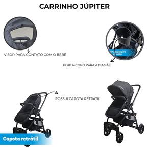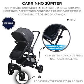 Carrinho de bebê 3 em 1 passear júpiter vira moisés travel system preto até 15 kg Este versátil carrinho 3 em 1 é a escolha ideal para pais modernos, oferecendo conforto e praticidade desde o nascimento até os 15kg da criança. Com um cinto de segurança de 5 pontos e estrutura em aço, o carrinho júpiter garante segurança e durabilidade incomparáveis. Seu assento reversível e ajustável em várias posições permite adaptar-se às necessidades dos pequenos em diferentes fases. O assento do carrinho júpiter pode ser transformado em um moisés para os momentos de descanso do bebê com facilidade. Possui 2 rodas dianteiras giratórias e fixas e 2 rodas traseiras com sistema único de freios, garantindo a estabilidade e mobilidade necessárias para os passeios. Além disso, com sistema de fechamento tipo envelope, tornamos o transporte e armazenamento do carrinho uma tarefa simples e rápida para os pais ocupados. E para oferecer ainda mais conveniência, ele é compatível com o bebê conforto aconchego vendido separadamente da passear, garantindo uma experiência completa desde os primeiros dias do bebê. Inmetro: 001548/2024 Características: Cor: preto Assento com ajuste em várias posições Cinto de segurança de 5 pontos Cesto com capacidade de 2 kg Capota retrátil Capa com extensor Porta copo Assento vira moisés Fechamento tipo envelope Freio com sistema único de acionamento nas rodas traseiras de 12 meses direto com o fabricante Medidas do carrinho aberto: 107 x 57 x 80 cm Marca: Não Informado