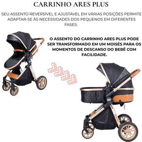 Carrinho de bebê 3 em 1 reversível vira moisés capota retrátil ares plus preto Carrinho de bebê 3 em 1 ares plus passear Este versátil carrinho 3 em 1 é a escolha ideal para os pais modernos, ofercendo conforto e praticidade desde o nascimento até os 15 kg da criança. Com um cinto de segurança de 5 pontos e estrutura em alumínio anodizado dourado, o carrinho ares plus garante segurança e durabilidade incomparáveis. Seu assento reversível e ajustável em várias posições, permitindo se adaptar as necessidades dos pequenos em diferentes fases. O assento do carrinho ares plus pode ser transformado em um moisés para os momentos de descanso do bebê com facilidade. Possui 2 rodas dianteiras giratórias e 2 traseiras com sistema único de freios, garantindo a estabilidade e mobilidade necessárias para os passeios. Além disso, com sistema de fechamento com uma única mão, tornamos o transporte e armazenamento do carrinho uma tarefa simples e rápida para os pais ocupados. Detalhes em material sintético conferem um toque de elegância e sofisticação ao design do carrinho ares plus. E para oferecer ainda mais conveniência, ele é compatível com o bebê conforto aconchego da passear, garantindo uma experiência completa desde os primeiros dias do bebê. Principais características: Carrinho 3 em 1 Cinto de segurança de 5 pontos Compatível com o bebê conforto aconchego vendido separadamente Assento reversível e ajustável para várias posições Assento transforma em moisés 2 rodas dianteiras giratórias Sistema único de freio nas rodas traseiras Detalhes em material sintético Cesto porta objeto com capacidade de 2 kg Capa de proteção para os pés Registro do produto no inmetro: 009618/2022 Medidas: - medida do carrinho aberto: 104x60x93 cm axlxp : 12 meses direto com o fabricante Homologação Inmetro: CE-BRI/IQB 005957 53000/19-013 Marca: Não Informado Ean: 7908488100980