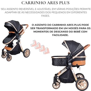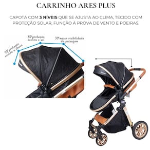 Carrinho de bebê 3 em 1 reversível vira moisés capota retrátil ares plus preto Carrinho de bebê 3 em 1 ares plus passear Este versátil carrinho 3 em 1 é a escolha ideal para os pais modernos, ofercendo conforto e praticidade desde o nascimento até os 15 kg da criança. Com um cinto de segurança de 5 pontos e estrutura em alumínio anodizado dourado, o carrinho ares plus garante segurança e durabilidade incomparáveis. Seu assento reversível e ajustável em várias posições, permitindo se adaptar as necessidades dos pequenos em diferentes fases. O assento do carrinho ares plus pode ser transformado em um moisés para os momentos de descanso do bebê com facilidade. Possui 2 rodas dianteiras giratórias e 2 traseiras com sistema único de freios, garantindo a estabilidade e mobilidade necessárias para os passeios. Além disso, com sistema de fechamento com uma única mão, tornamos o transporte e armazenamento do carrinho uma tarefa simples e rápida para os pais ocupados. Detalhes em material sintético conferem um toque de elegância e sofisticação ao design do carrinho ares plus. E para oferecer ainda mais conveniência, ele é compatível com o bebê conforto aconchego da passear, garantindo uma experiência completa desde os primeiros dias do bebê. Principais características: Carrinho 3 em 1 Cinto de segurança de 5 pontos Compatível com o bebê conforto aconchego vendido separadamente Assento reversível e ajustável para várias posições Assento transforma em moisés 2 rodas dianteiras giratórias Sistema único de freio nas rodas traseiras Detalhes em material sintético Cesto porta objeto com capacidade de 2 kg Capa de proteção para os pés Registro do produto no inmetro: 009618/2022 Medidas: - medida do carrinho aberto: 104x60x93 cm axlxp : 12 meses direto com o fabricante Homologação Inmetro: CE-BRI/IQB 005957 53000/19-013 Marca: Não Informado Ean: 7908488100980