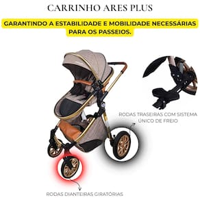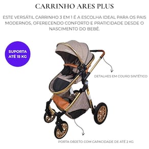 Carrinho de bebe 3 em 1 reversível vira moisés capota retrátil passear ares plus marrom grena Carrinho de bebê 3 em 1 ares plus passear Este versátil carrinho 3 em 1 é a escolha ideal para os pais modernos, ofercendo conforto e praticidade desde o nascimento até os 15 kg da criança. Com um cinto de segurança de 5 pontos e estrutura em alumínio anodizado dourado, o carrinho ares plus garante segurança e durabilidade incomparáveis. Seu assento reversível e ajustável em várias posições, permitindo se adaptar as necessidades dos pequenos em diferentes fases. O assento do carrinho ares plus pode ser transformado em um moisés para os momentos de descanso do bebê com facilidade. Possui 2 rodas dianteiras giratórias e 2 traseiras com sistema único de freios, garantindo a estabilidade e mobilidade necessárias para os passeios. Além disso, com sistema de fechamento com uma única mão, tornamos o transporte e armazenamento do carrinho uma tarefa simples e rápida para os pais ocupados. Detalhes em material sintético conferem um toque de elegância e sofisticação ao design do carrinho ares plus. E para oferecer ainda mais conveniência, ele é compatível com o bebê conforto aconchego da passear, garantindo uma experiência completa desde os primeiros dias do bebê. Principais características: Carrinho 3 em 1 Cinto de segurança de 5 pontos Compatível com o bebê conforto aconchego vendido separadamente Assento reversível e ajustável para várias posições Assento transforma em moisés 2 rodas dianteiras giratórias Sistema único de freio nas rodas traseiras Detalhes em material sintético Cesto porta objeto com capacidade de 2 kg Capa de proteção para os pés Registro do produto no inmetro: 009618/2022 Medidas: - medida do carrinho aberto: 104x60x93 cm axlxp : 12 meses direto com o fabricante Homologação Inmetro: CE-BRI/ICEPEX-I 02439-25-5 Marca: Não Informado